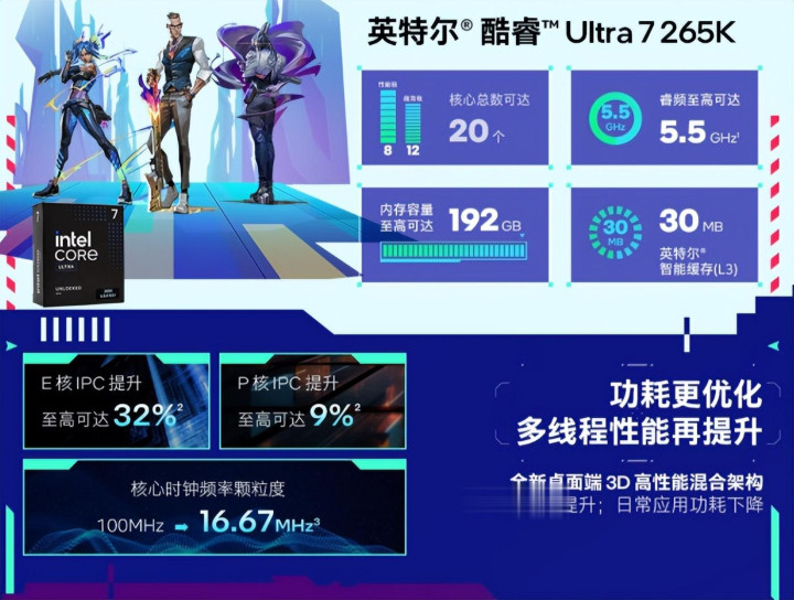 在处理器方面,英特尔酷睿 Ultra 7 265K 凭借全新的 Arrow Lake 架构 展现了其卓越实力。它采用 8个性能核与12个能效核 组成的20核设计,虽然取消了超线程技术,但通过革命性的能效核强化,在多线程任务与高负载生产力应用中依然表现强劲,能够同时满足游戏玩家与内容创作者的苛刻需求。