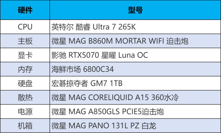 我们以英特尔酷睿Ultra 7 265K处理器和微星B860M迫击炮主板构成性能基石;显卡则选用影驰RTX 5070,作为畅玩2K游戏的核心;内存采用海鲜市场的高频DDR5,用最小的成本撬动英特尔平台的最大内存性能收益;最后辅以微星全家桶的机电散,在保证稳定、高效散热与供电的同时,通过统一的“白龙”海景房机箱构建出清爽整洁的视觉风格。