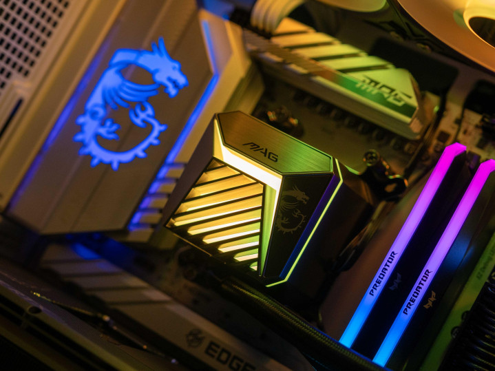 最后,整套硬件被容纳在微星 MAG PANO 131L PZ 白龙机箱内。这款海景房机箱通过双面全景玻璃提供了270°的沉浸式视野,同时四面通风网板与支持最多10风扇的立体风道设计,巧妙平衡了硬件展示与高效散热的需求。免工具拆装与预埋线材设计也让装机理线过程变得简单直观。