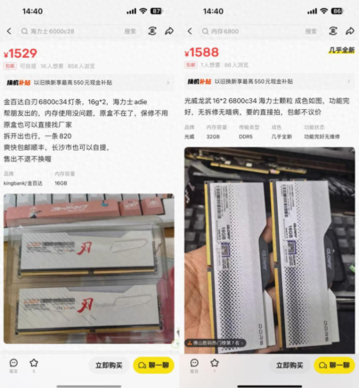 更值得一提的是,在海鲜市场上,出现了不少品相不错的二手DDR5 6800C34内存,价格极具吸引力。而英特尔平台,尤其是新架构的Ultra处理器,对DDR5高频内存的优化与支持向来出色。如果你苦等一年仍未入手,不妨转换思路,将目光投向英特尔平台。